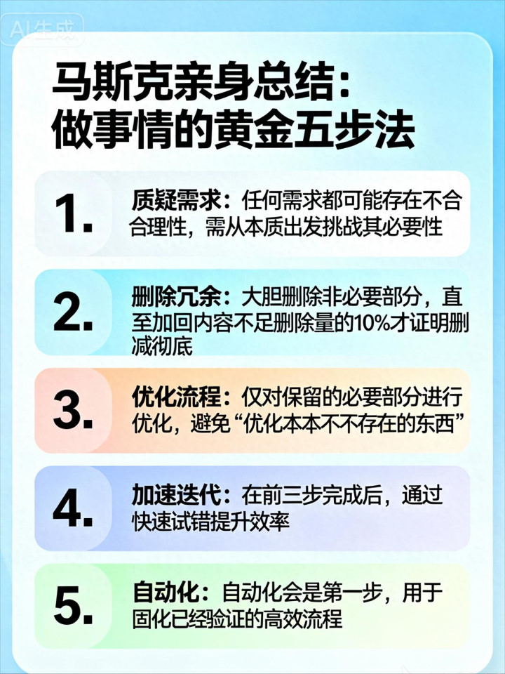 马斯克五步工作法的本质,不是一套 “项目执行技巧”,而是一种 “组织设计哲学”:它相信优秀的项目生态,不是靠管控出来的,而是靠设计出来的 —— 设计一套让好项目能快速推进、坏项目能自动淘汰的机制,组织自然能摆脱内耗,聚焦增长。
