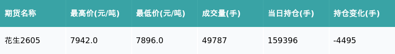 南财智讯2月26日电,盘后期货数据显示,郑州商品交易所的花生主力合约收跌0.38%,收盘报7902.0元/吨,日内资金流出2784.65万元。其他相关指标见下表: