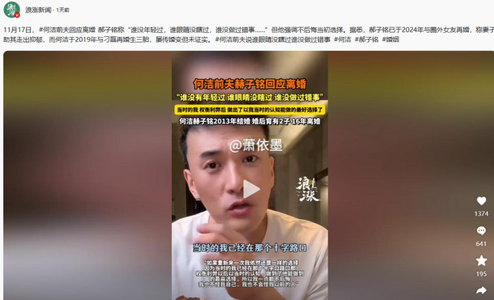 浪张新闻《11月17日,#何洁前夫回应离婚 郝子铭称“谁没年轻过,谁眼睛没瞎过,谁没做过错事……”但他强调不后悔当初选择。据悉,郝子铭已于2024年与圈外女友再婚,称妻子助其走出抑郁,而何洁于2019年与刁磊再婚生三胎,屡传婚变但未证实。#何洁前夫说谁眼睛没瞎过谁没做过错事》