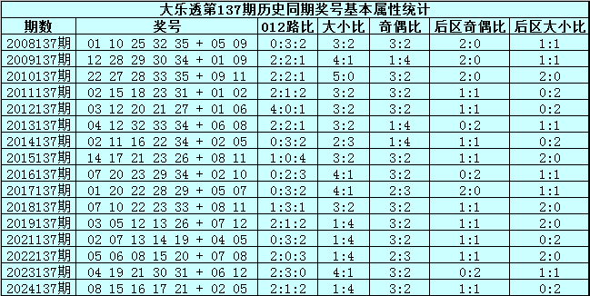 大乐透第2025137期历史同期号码分析: