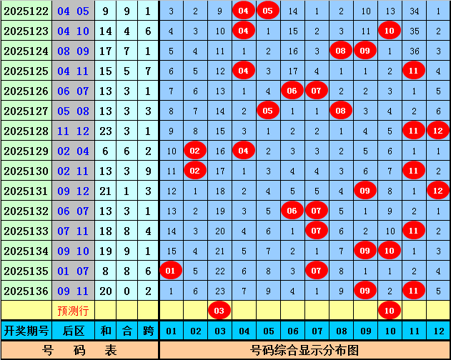 后区推荐:第137期历史同期后区奇偶比总比例为17:15,偶数表现较冷,本期防止回补,关注一奇一偶组合开出,看好两码03、10。