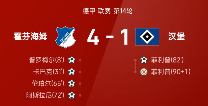 易边再战,霍村继续扩大比分优势。第65分钟,霍村右路长传禁区,图雷头球摆渡,伦珀尔接球转身小角度推射破门,霍村3-0。第72分钟,普拉斯左路下底传中,阿斯拉尼门前抢点垫射破门,霍村4-0。第82分钟,维埃拉传球,菲利普高速突入禁区抽射近角得手,汉堡1-4。第90+1分钟,汉堡获得点球,菲利普点射被门将扑出。