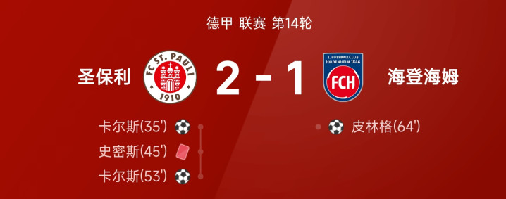 易边再战,圣保利率先破门。第53分钟,卡尔斯接应队友直塞突入禁区推射破门梅开二度,圣保利2-0。第64分钟,布斯策吊入禁区,斯基默禁区内横敲,皮林格门前推射破门,海登海姆2-1。此后双方再无建树,10人圣保利主场力克海登海姆。