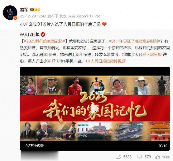 第一件是小米玄戒O1芯片入选“人民日报”“2025我们的家国记忆”。人民日报表示:就要和2025说再见了,这一年见证了哪些难忘时刻?有热爱拼搏,有市井烟火,也有国安家好……这是每一个你我的故事,也是我们共同的家国记忆。2026即将到来,提前送上新年祝福。更厉害的是人民日报拿10台小米17 Ultra作为奖品;