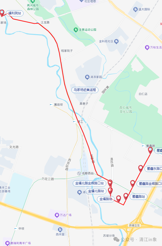 在赶集专线试运行期间,发车时间为上午9点半,返程时间为当日上午11点,每逢2、5、8日开行。往返全程采用同线运行模式,居民可原路往返,出行更安心。去程以蜀鑫路金泽路口站为起点,沿途依次停靠蜀鑫东路口站、蜀鑫路站、金福路站、金福路西站、金福北路金辉路口站,最终抵达土龙路福利院站,直达马家场集市核心区域;返程从土龙路福利院站发车,沿原线路返回至蜀鑫路金泽路口站,真正实现家门口上车、场口下车的一站式出行。